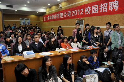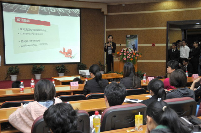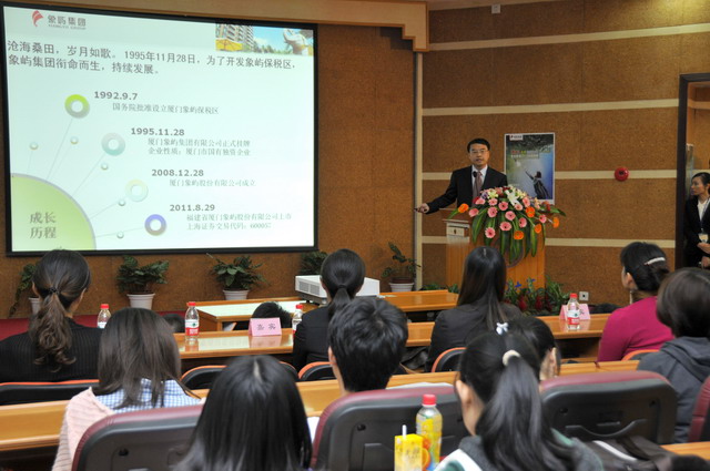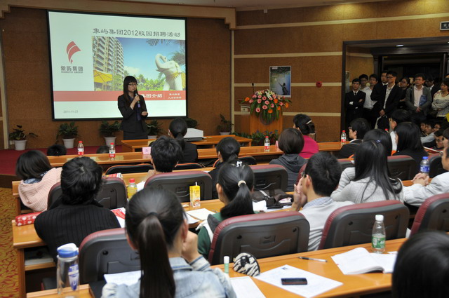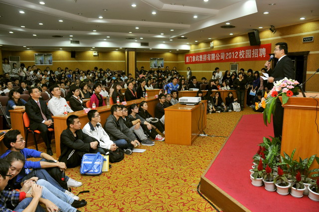 2012年象嶼集團全國校園招聘首場宣講會于1123晚在廈門大學(xué)拉開帷幕。集團人力資源總監(jiān)林志勇、象嶼股份人力資源部經(jīng)理林焱為同學(xué)們進行了精彩的宣講并回答了同學(xué)們現(xiàn)場的提問,鼓勵廈大的優(yōu)秀學(xué)子們加入到象嶼的大家庭。據(jù)悉,此次宣講會吸引了近500位應(yīng)屆生參加,場面火爆,提問環(huán)節(jié)積極踴躍,會后現(xiàn)場收到簡歷近500 份。
