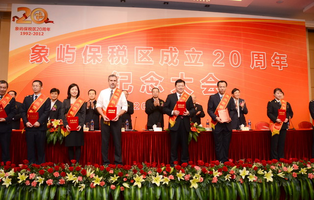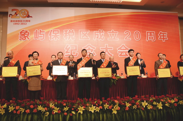 11月28日上午,在慶祝廈門象嶼保稅區(qū)成立20周年的喜慶日子里,廈門市委、市政府隆重舉行慶祝大會,回顧保稅區(qū)20年的奮斗歷程,總結(jié)保稅區(qū)20年的發(fā)展經(jīng)驗,展望保稅區(qū)更加美好的發(fā)展未來。為保稅區(qū)建設(shè)立下汗馬功勞的10家突出貢獻企業(yè)和10位突出貢獻個人受到了隆重表彰。其中,廈門象嶼集團有限公司、廈門象嶼股份有限公司榮獲突出貢獻企業(yè),象嶼集團黨委書記、董事長王龍雛,象嶼建設(shè)集團常務(wù)副總經(jīng)理王澍陶榮獲突出貢獻個人。