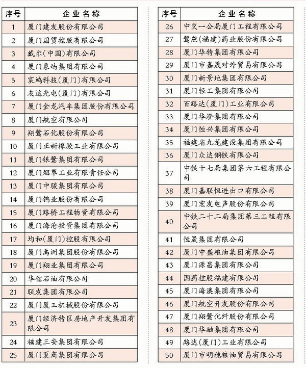 2014廈門企業(yè)100強(qiáng)榜單