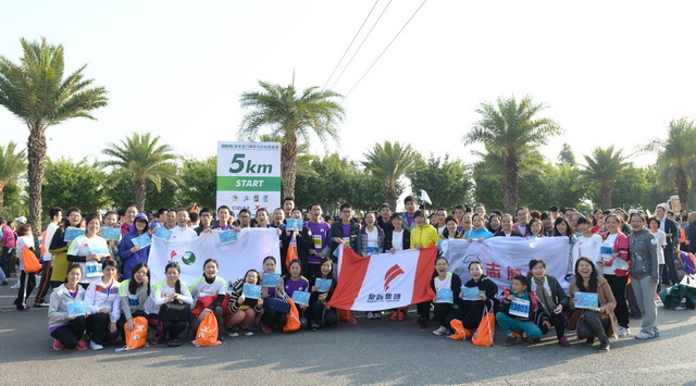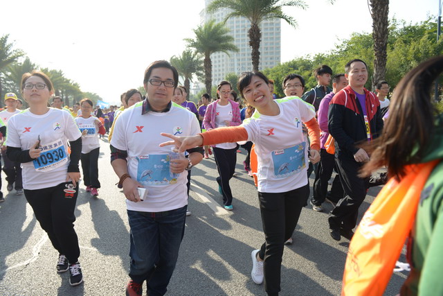 盡管冬日清晨有些凍人,但這絲毫沒有“凍”壞象嶼人的熱情。一進入賽場,大家就摩拳擦掌,躍躍欲試。今年的馬拉松對象嶼跑團而言,有著特殊的意義,這不僅是一場健康跑,更是一場公益跑。此次比賽跑道恰好與火燒嶼隔海相望,由集團捐資建立的中華白海豚救護繁育基地正坐落島上。白海豚的可愛形象也隨之出現(xiàn)在象嶼“跑男”“跑女”的前胸、后背。公益旗幟、白海豚公益宣傳貼紙,紅帆logo,以及我們朝氣蓬勃的象嶼跑團組成了一道“有愛”的風(fēng)景線。這也吸引了周圍許多馬拉松參賽者的目光,有的參賽者甚至圍上前來詢問是否也能加入其中。于是,象嶼救助白海豚的公益之舉隨著象嶼人的奔跑也一路傳播開來。