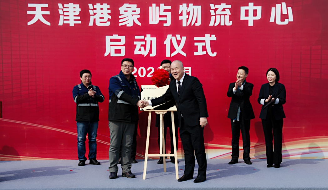 天津港集團業(yè)務(wù)經(jīng)營部物流中心主任劉鵬,天津港國際物流黨總支書記、董事長趙明,天津港國際物流黨總支副書記、總經(jīng)理趙毅,象嶼速傳總經(jīng)理孫剛,象嶼速傳副總經(jīng)理胡方等為天津港象嶼物流中心揭牌。