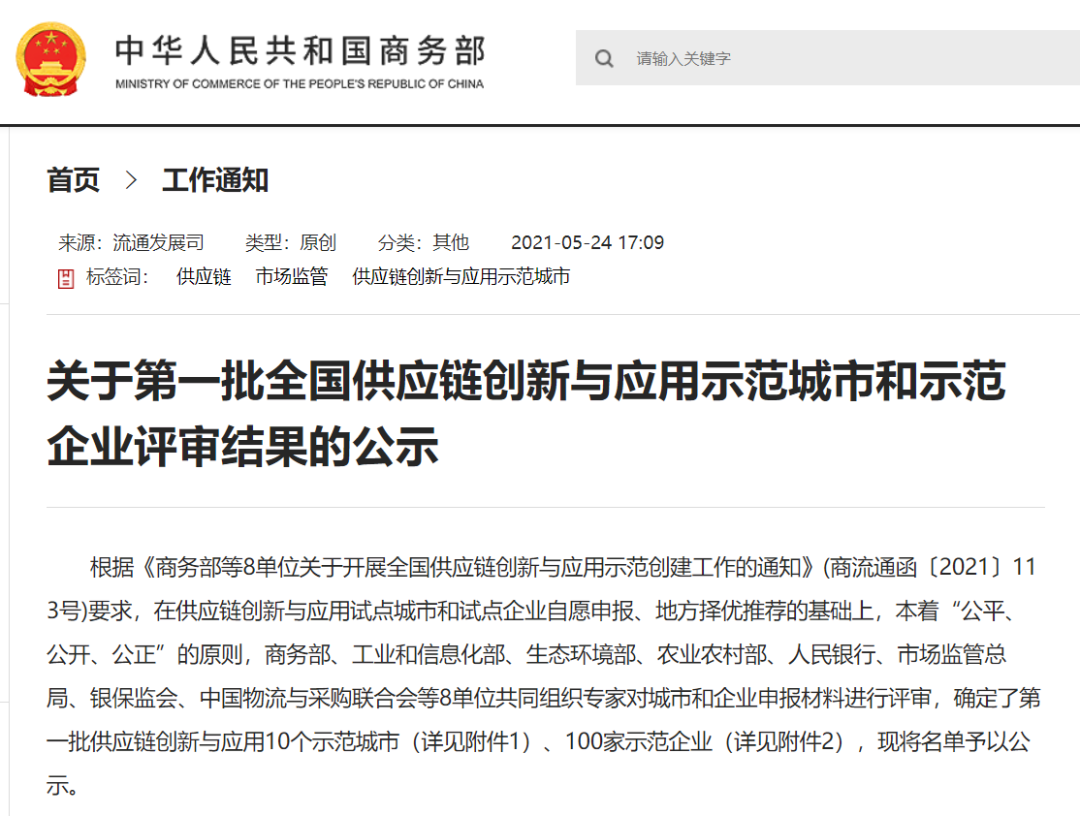 商務(wù)部此次公示的“全國供應(yīng)鏈創(chuàng)新與應(yīng)用示范城市和示范企業(yè)評審結(jié)果”,是商務(wù)部、工業(yè)和信息化部、生態(tài)環(huán)境部、農(nóng)業(yè)農(nóng)村部、人民銀行、市場監(jiān)管總局、銀保監(jiān)會、中國物流與采購聯(lián)合會等8單位共同組織專家對城市和企業(yè)申報材料進行評審確定的結(jié)果。