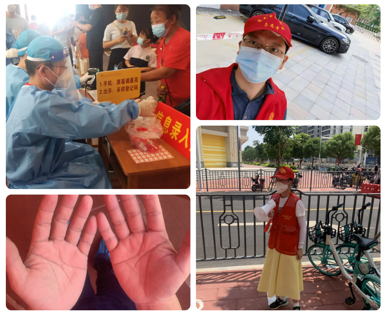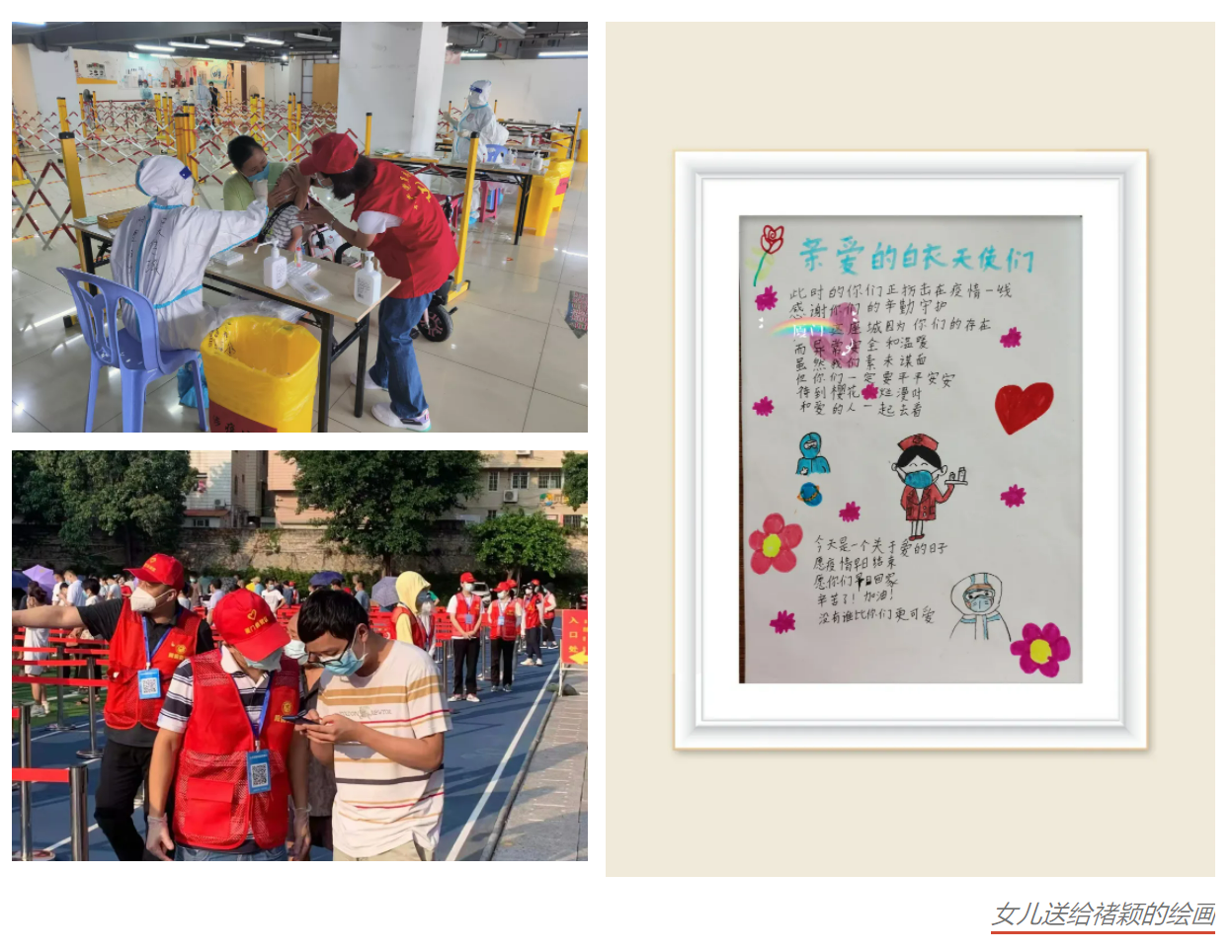 來自象嶼速傳黨辦的禇穎與她愛人更是雙方齊上陣,兩人錯開時間進行志愿服務,一人在外幫助市民進行核酸檢測,一人在家照顧孩子,既顧好“小家”也顧著“大家”。當她完成志愿者任務,給女兒看了自己的照片后,女兒忽閃忽閃的大眼睛直直地看著媽媽說:“媽媽,真不容易,應該很熱吧!”夫妻二人用親身經歷給孩子樹立了一個好榜樣!