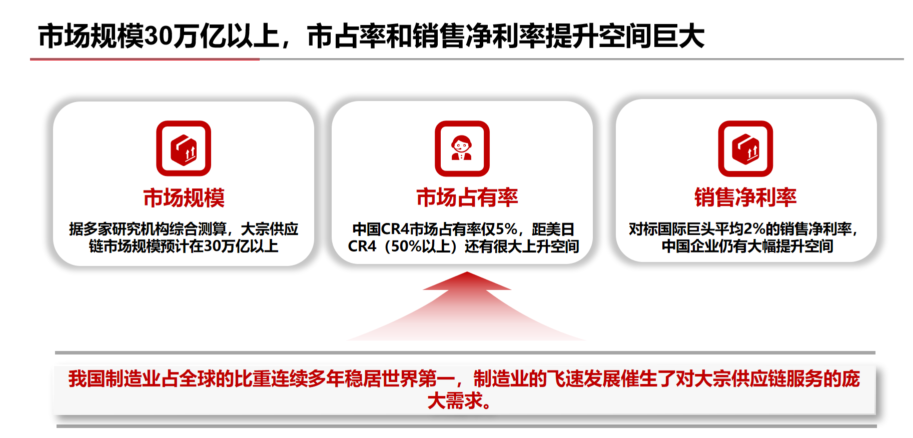 制造業(yè)企業(yè)日益專業(yè)化,對(duì)供應(yīng)鏈服務(wù)的需求從簡(jiǎn)單追求成本,轉(zhuǎn)變?yōu)楦非笮?,市?chǎng)亟需能提供“一攬子”服務(wù)、具備效率優(yōu)勢(shì)的大宗供應(yīng)鏈服務(wù)商。