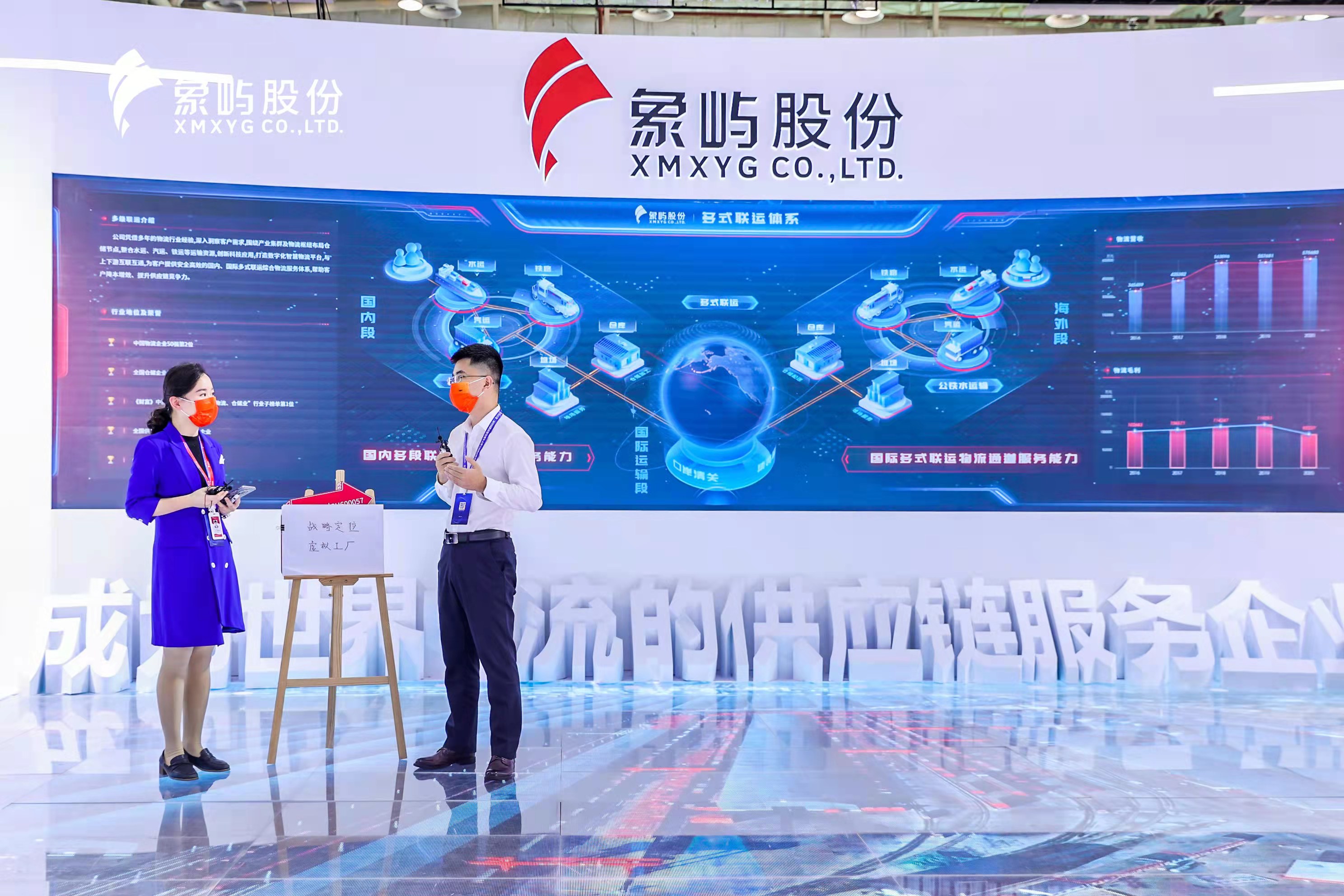 天屏地屏主屏三屏互動, 全景地屏展現(xiàn)了象嶼股份農產品、能源化工、金屬礦產供應鏈板塊的業(yè)務亮點,通過東北象嶼糧倉、陜西場站、印尼不銹鋼冶煉項目等典型項目實景展示,進一步詮釋象嶼業(yè)務模式及國際化發(fā)展!