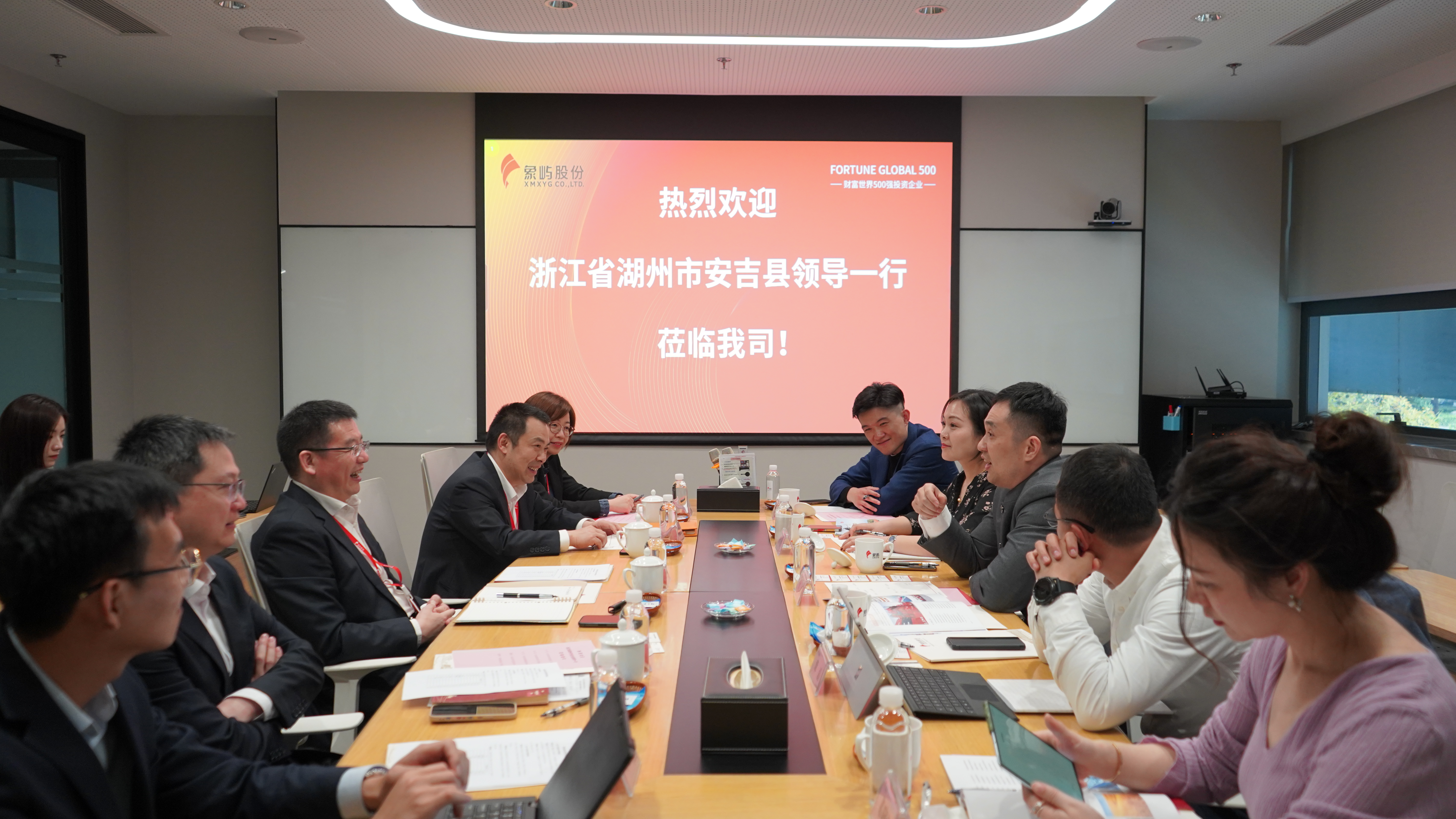 座談會(huì)上,鄧啟東董事長(zhǎng)對(duì)劉清局長(zhǎng)一行的到來(lái)表示歡迎,并向來(lái)賓們?cè)敿?xì)介紹了象嶼股份的發(fā)展歷程、主要業(yè)務(wù)板塊及經(jīng)營(yíng)思路。鄧啟東表示,安吉是習(xí)近平總書(shū)記“兩山理論”的發(fā)源地,秉承“綠水青山就是金山銀山”的理念,安吉的發(fā)展成就有目共睹。象嶼股份也一直堅(jiān)持綠色發(fā)展道路,希望未來(lái)能與安吉多溝通多互動(dòng),找到政企合作新空間。